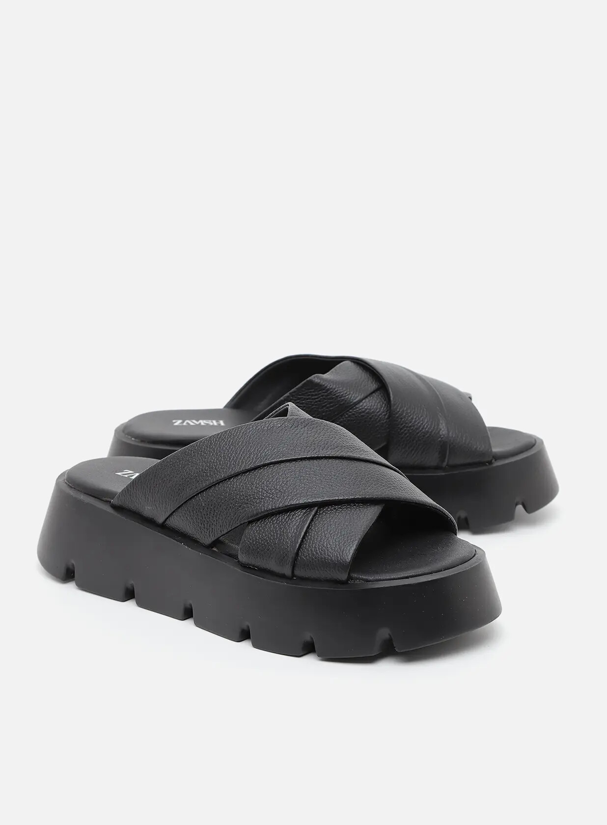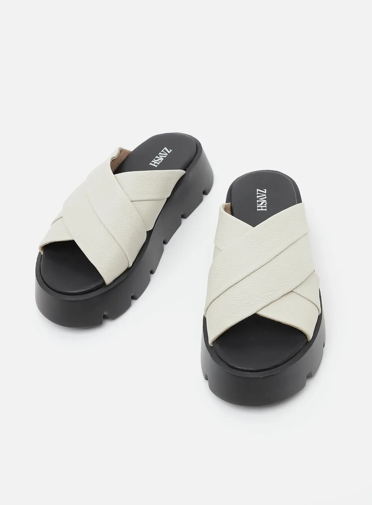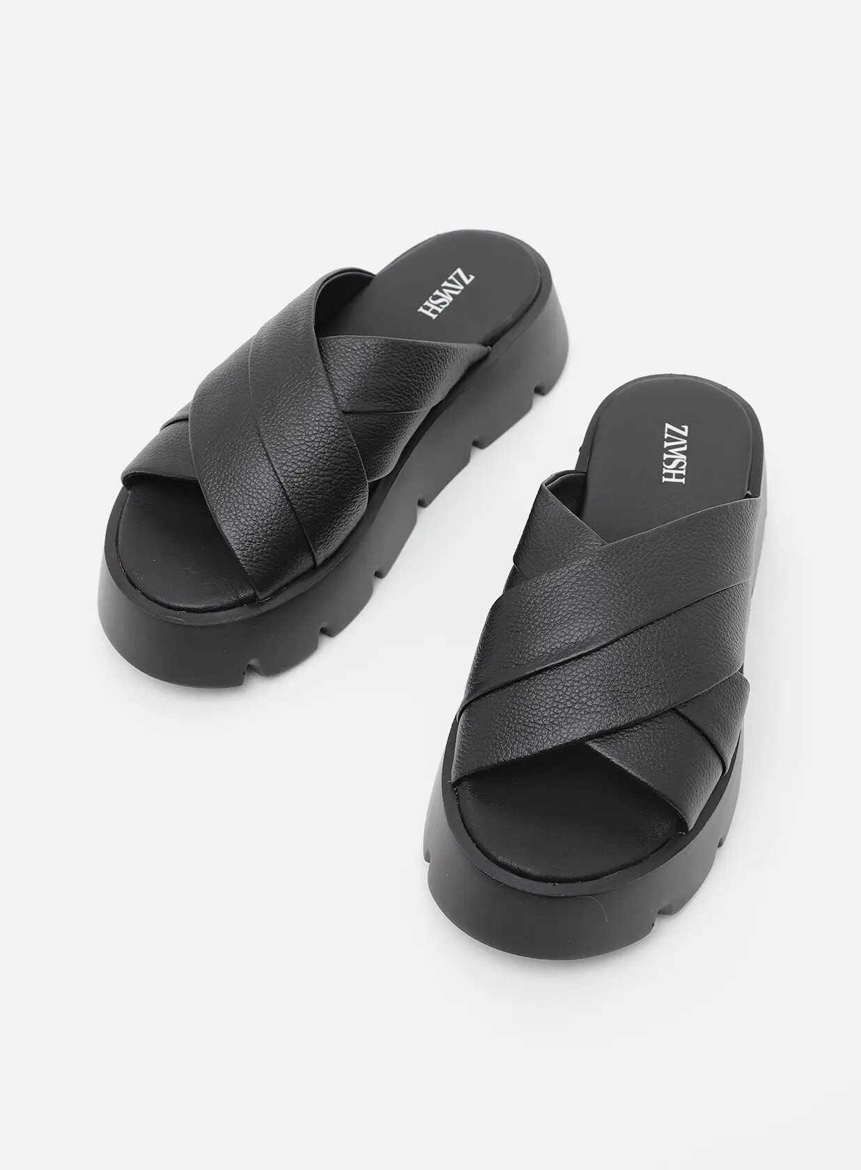 .כפכפים עם רצועות עור בצורת איקס (X) על גבי כף הרגל, המונחות על סוליית פלטפורמה שחורה עבה ומחורצת