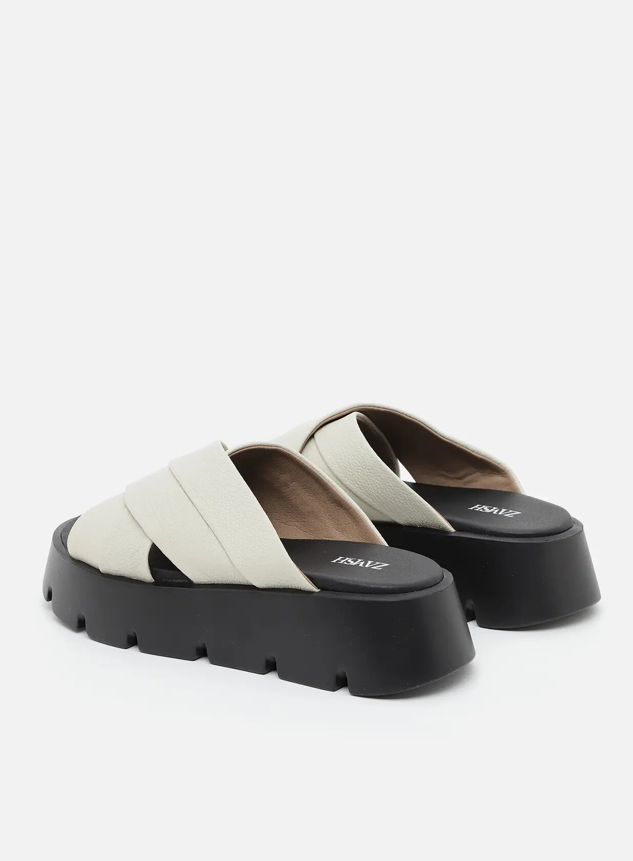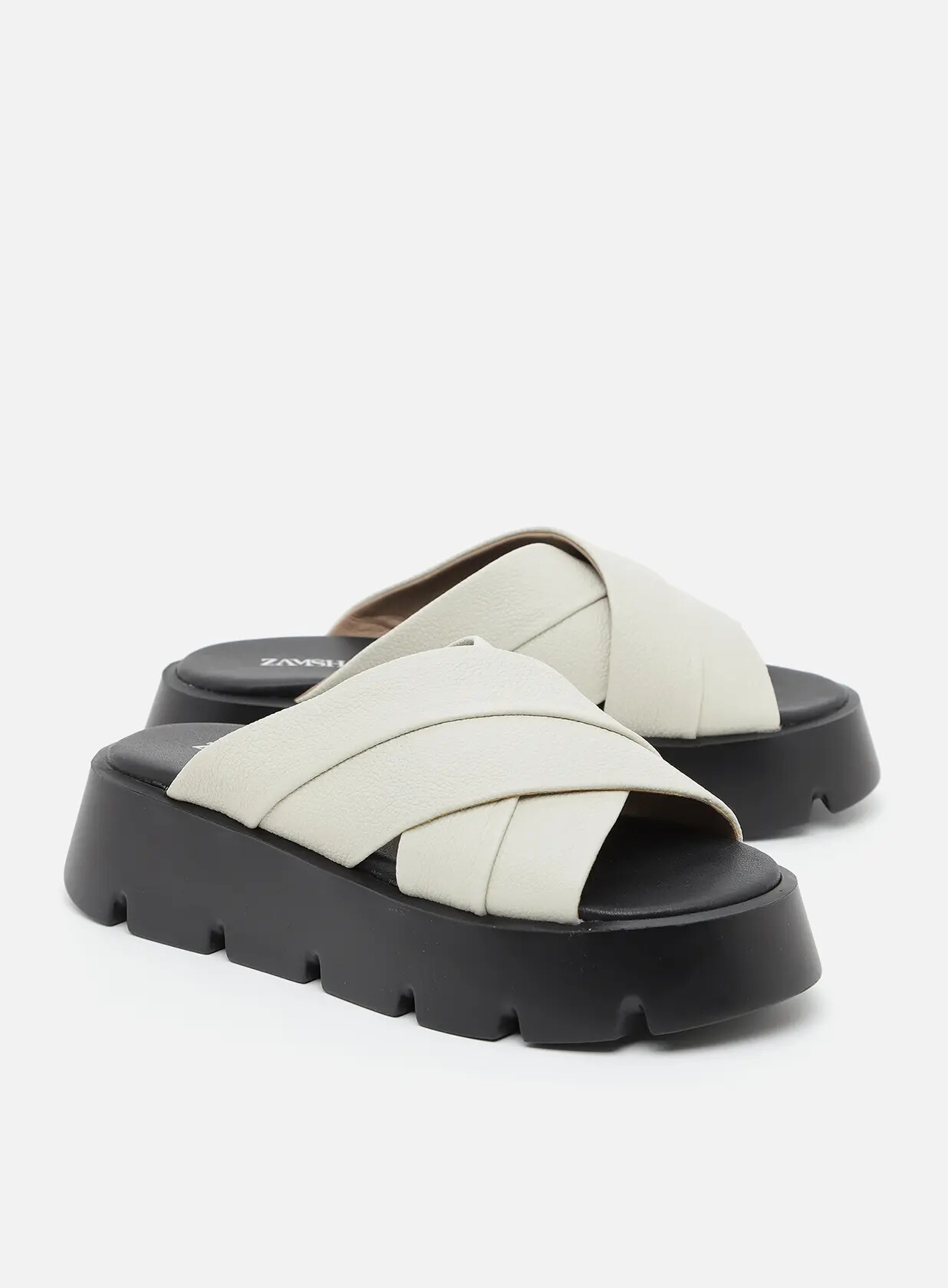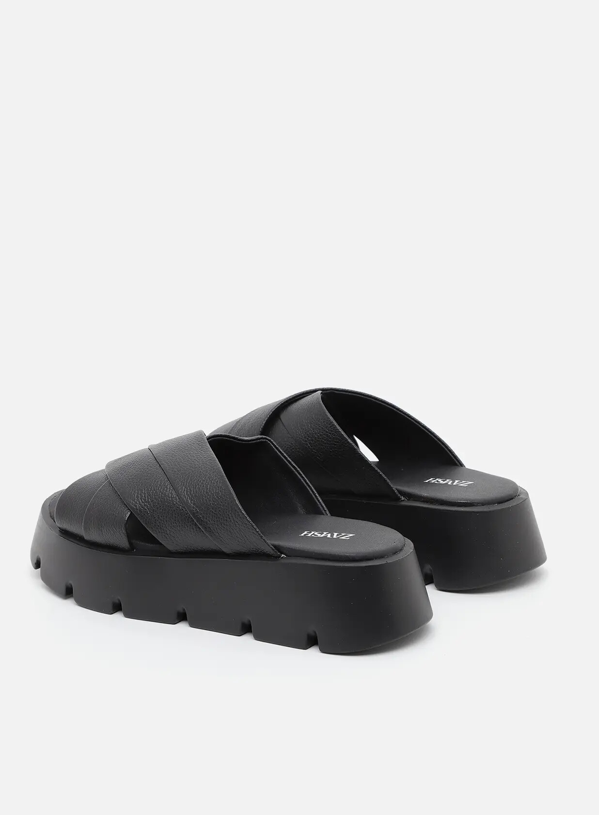 .כפכפים עם רצועות עור בצורת איקס (X) על גבי כף הרגל, המונחות על סוליית פלטפורמה שחורה עבה ומחורצת