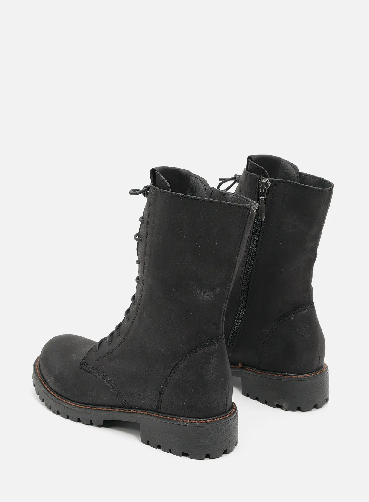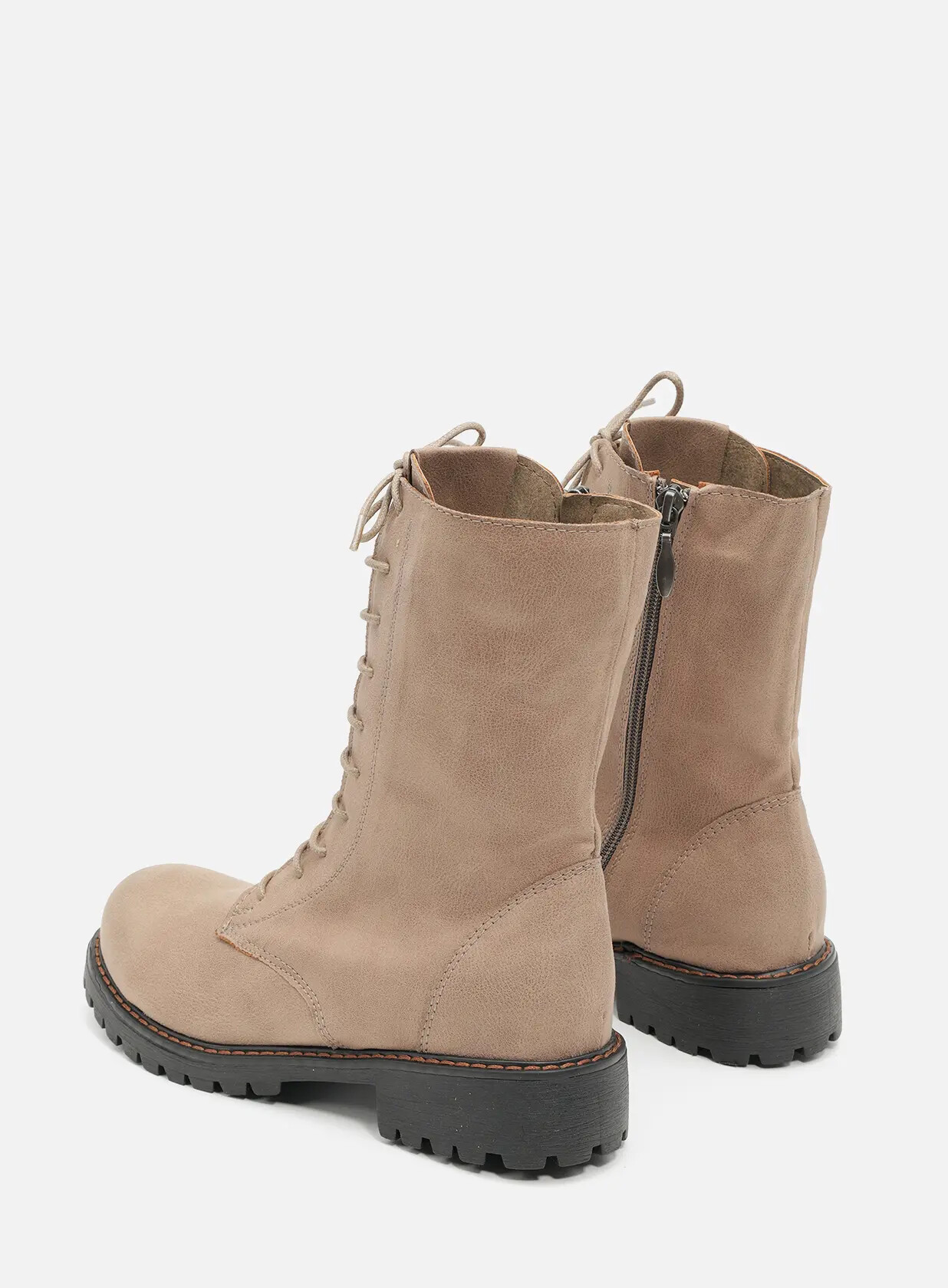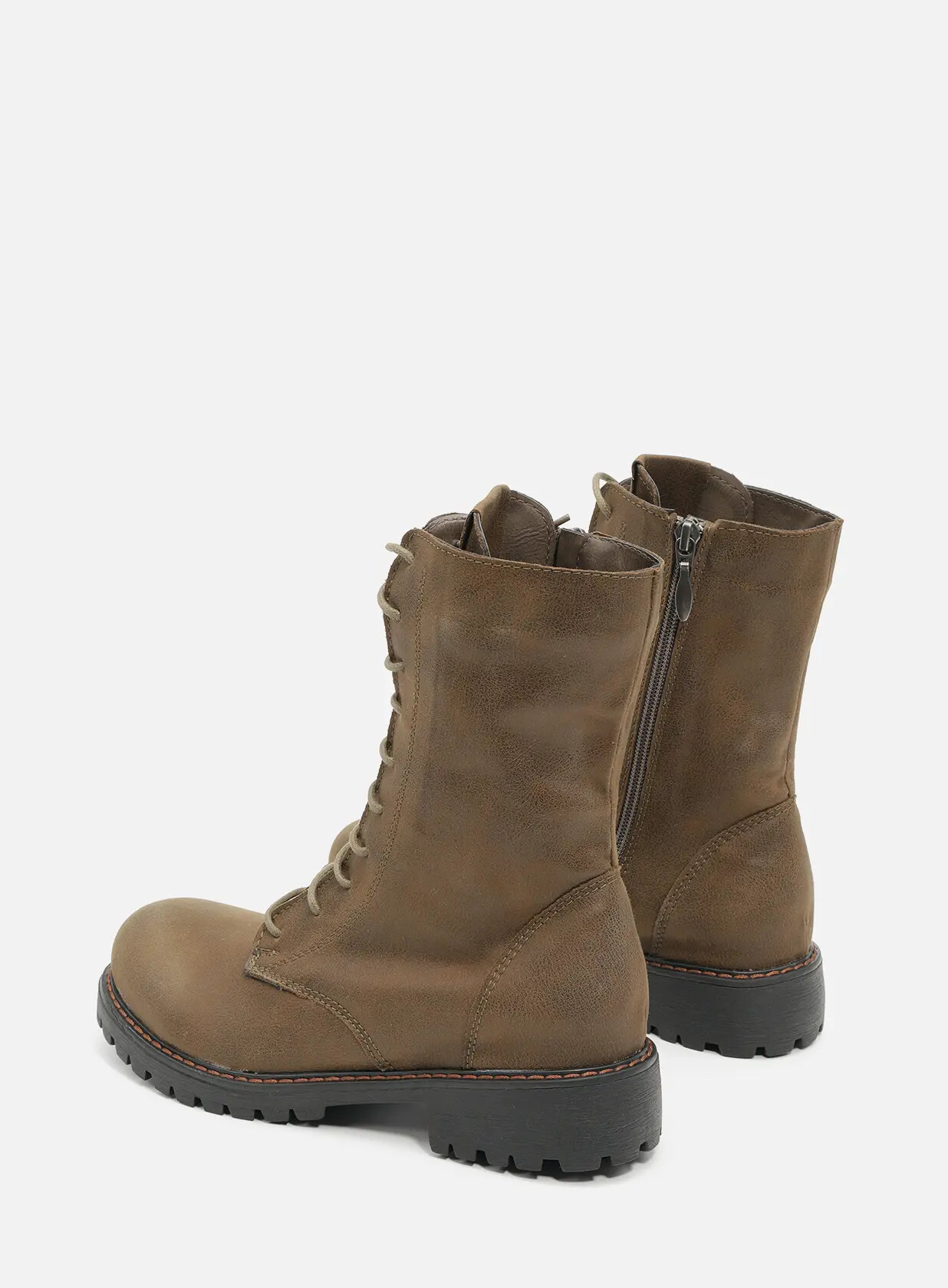 מגפונים גבוהים טבעוניים עם שרוכים ורוכסן בצבע תואם, סיומת מעוגלת, סוליה משוננת, עקב נמוך ותפרים צהובים.