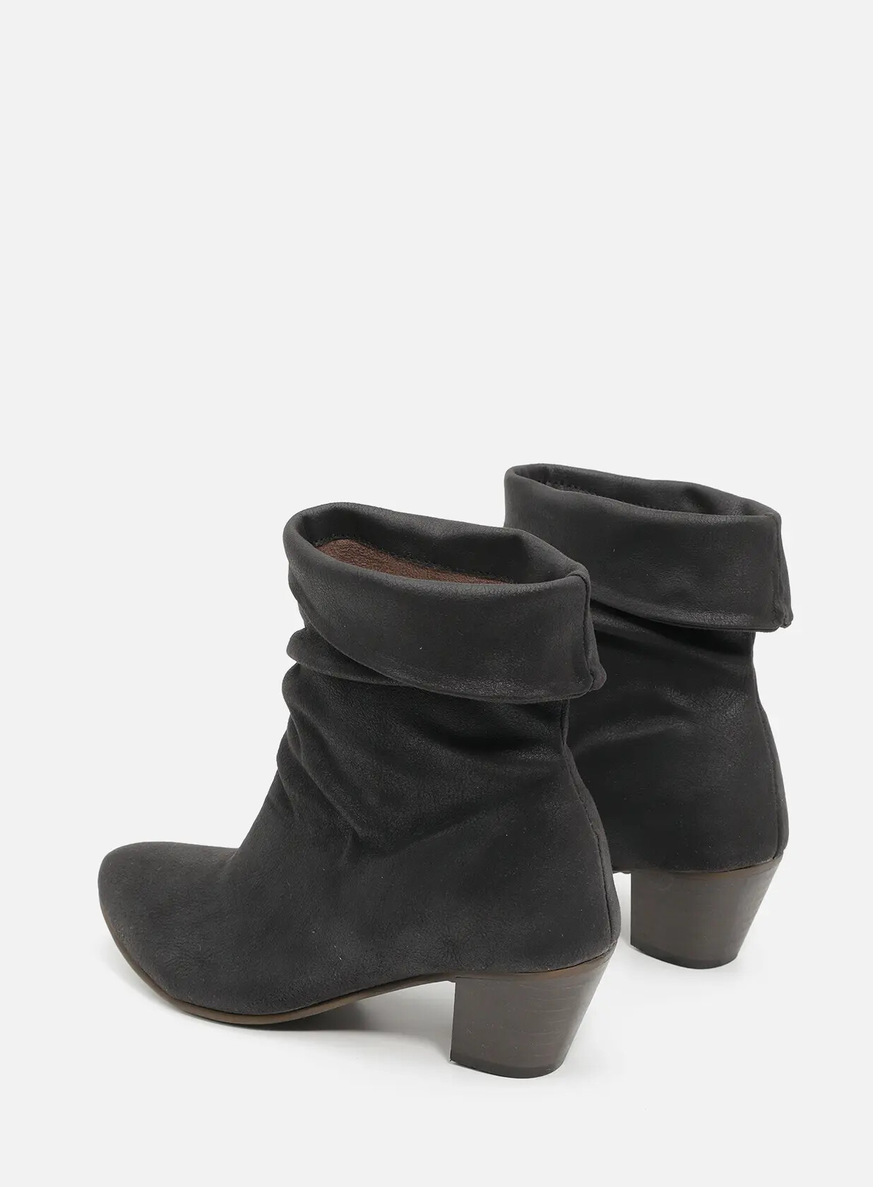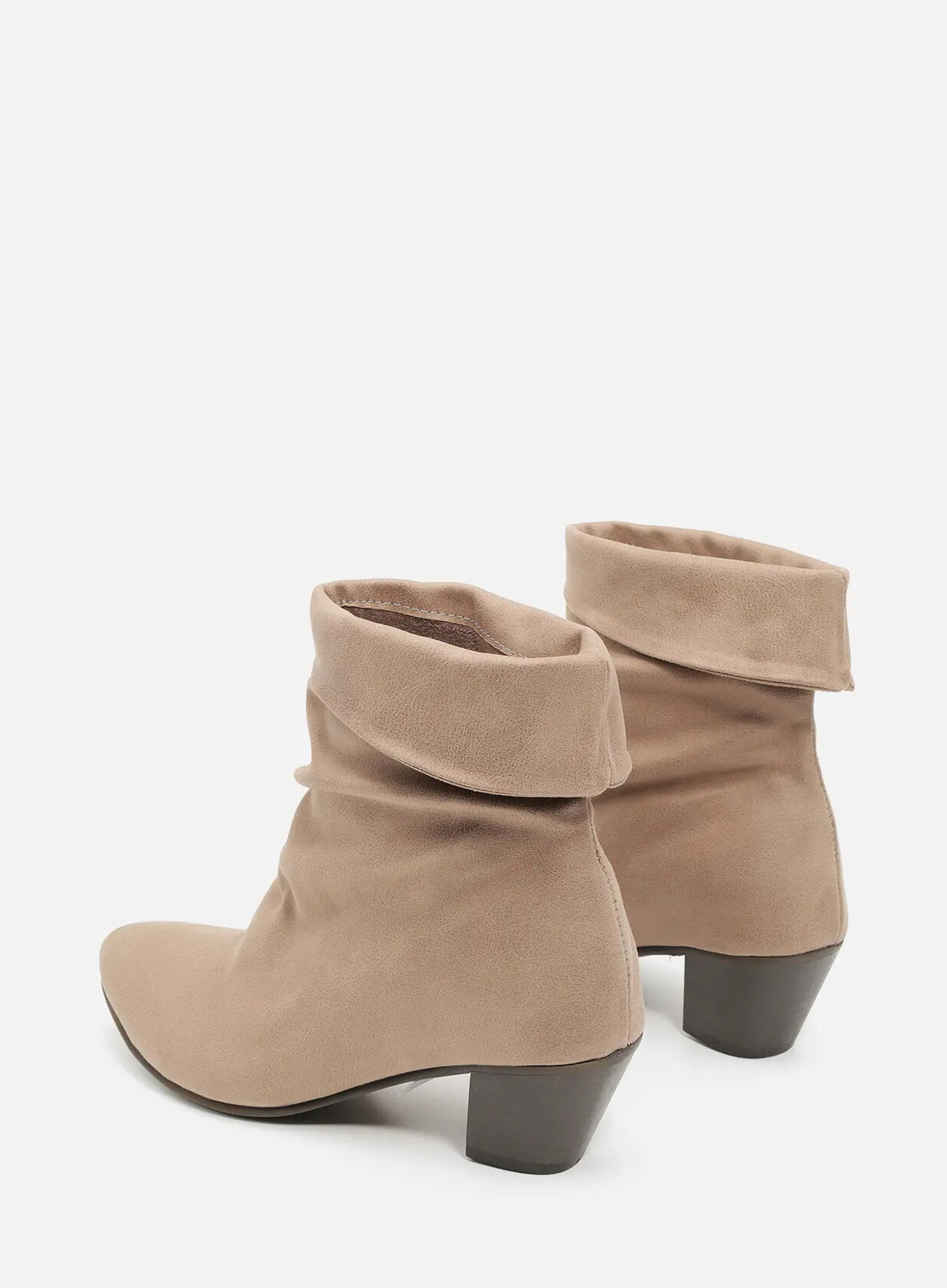 מגפיים מבד טבעוני מיקרו איכותי ורך הניתן לקיפול על הרגל, בהשראת עיצוב החותלות משנות ה – 80 עם חרטום צר ומעוגל מעט בקצה ועקב בינוני.