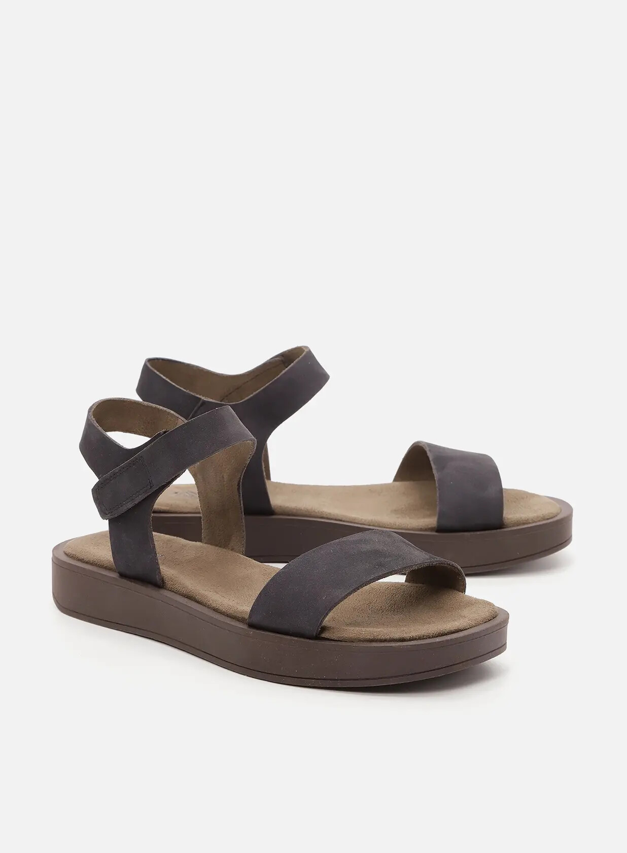 סנדלים מעור נובוק קלאסיים, עם רצועה קדמית ורצועה חובקת קרסול עם סגירת סקוטש, גפה מרופדת לנוחות מקסימלית וסוליית פלטפורמה עדינה.