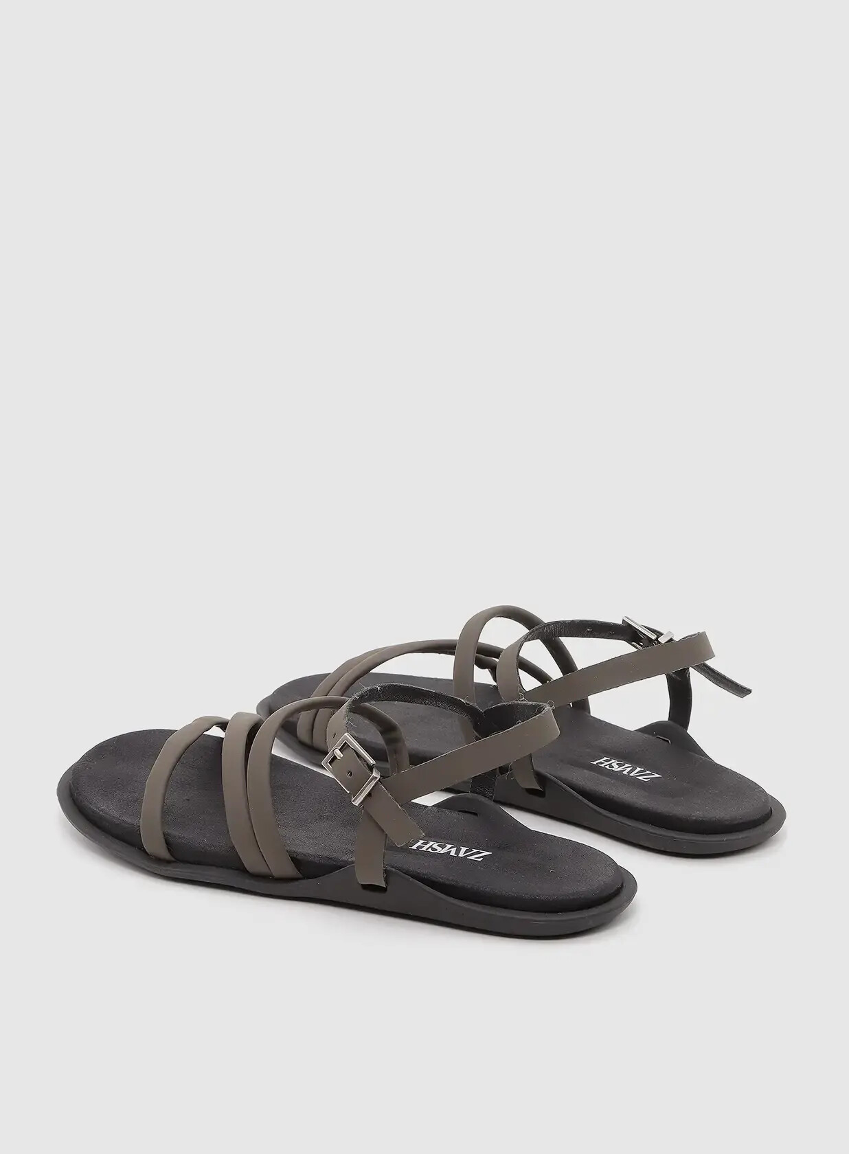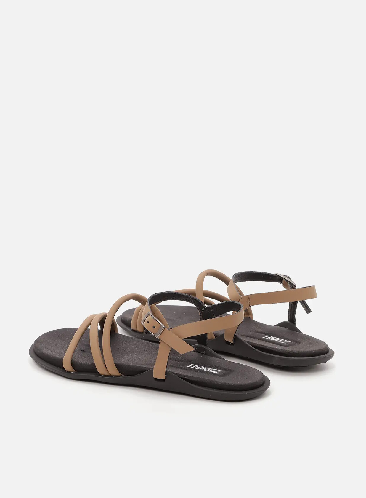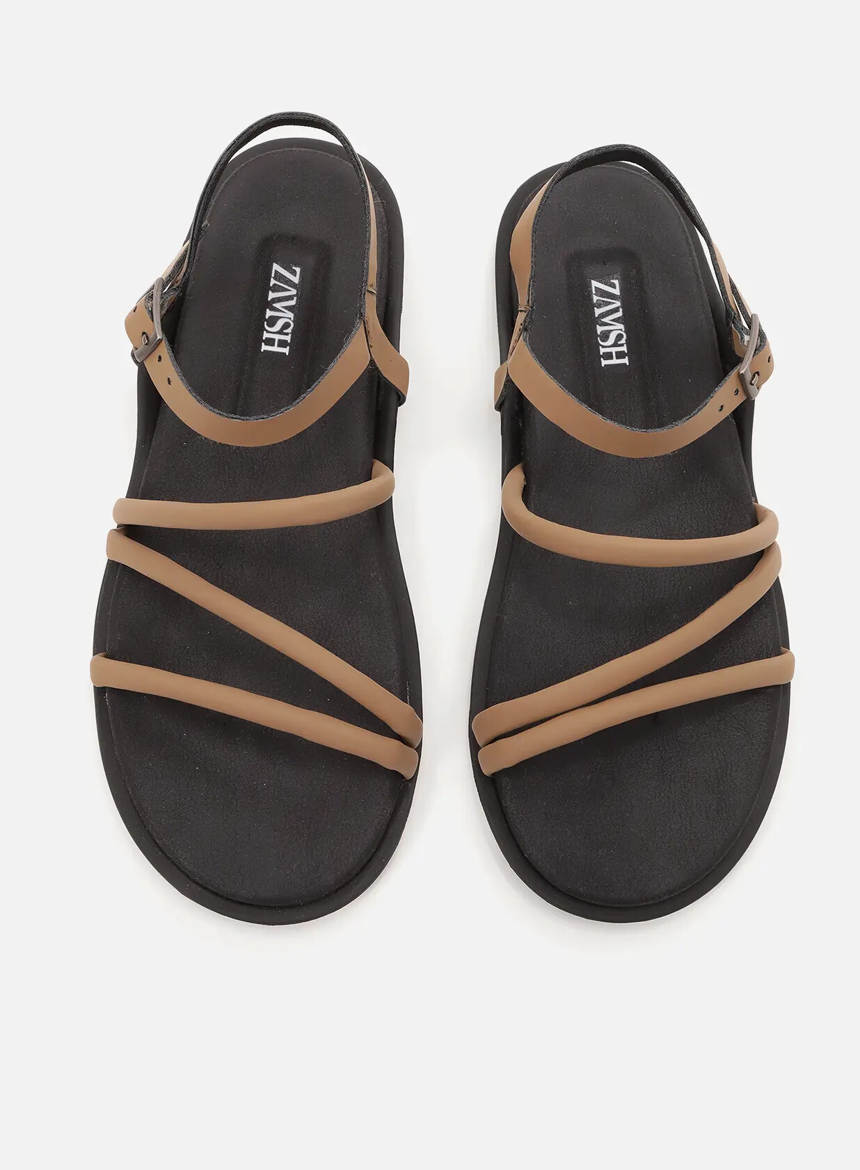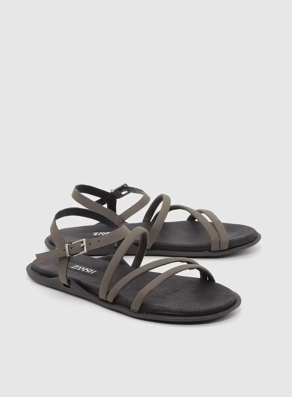 סנדלים שטוחים טבעוניים עם רצועות ישרות ואלכסוניות וסביב הקרסול המספקות תמיכה ועוטפות את הכף הרגל.  וסוליה גמישה המספקת נוחות ויציבות.