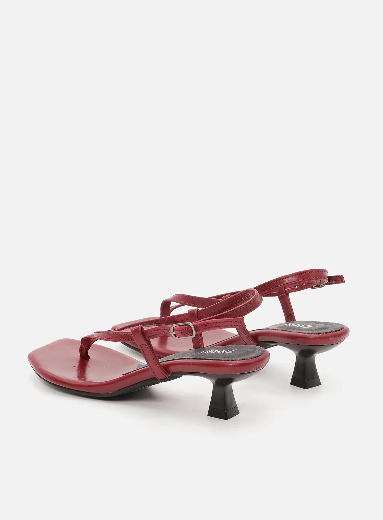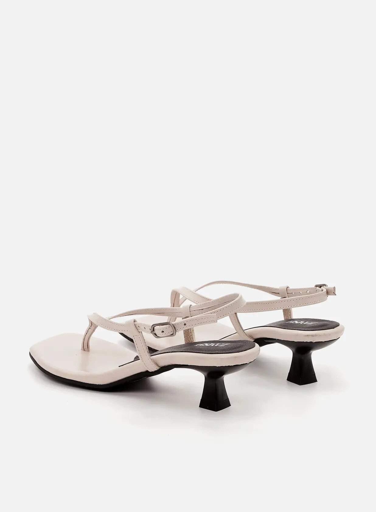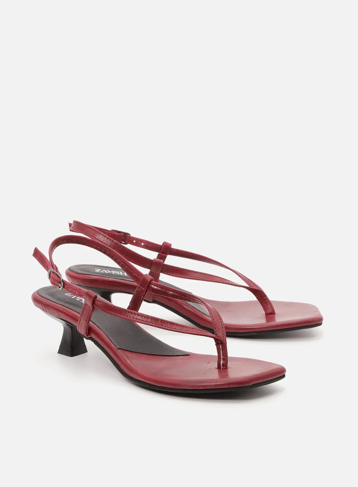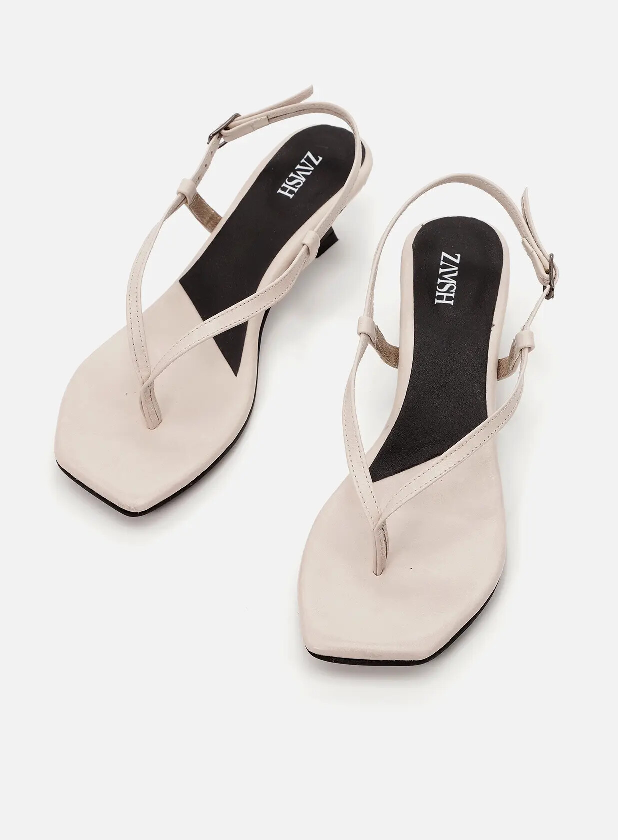 סנדלי עקב אצבע מעור, סיומת ישרה מלפנים, שתי רצועות דקות בצורת V לאורך הרגל ורצועת סגירה סביב הקרסול.