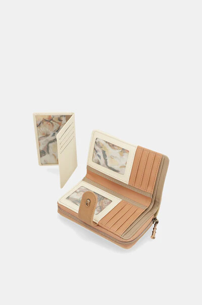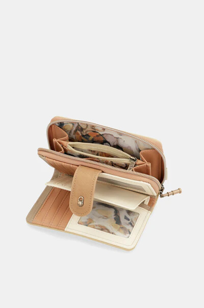 ארנק בגודל בינוני זה כולל שני תאים: תא אחורי עם סגירת קפץ, שמכיל מקום לכרטיסים וכספים; ותא עליון עם סגירת רוכסן, בו יש מקום לכסף קטן. כל פנים הארנק מרופד.