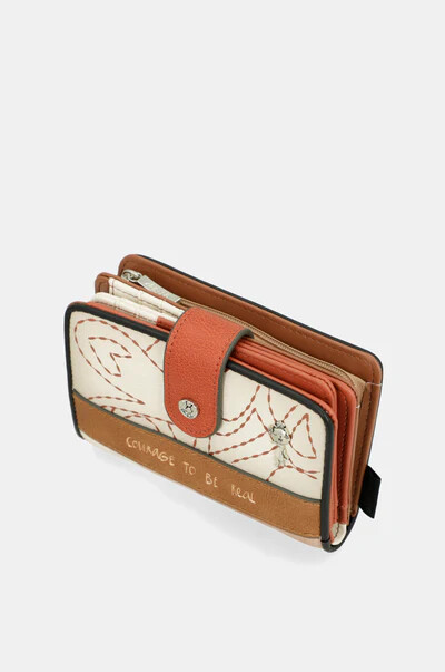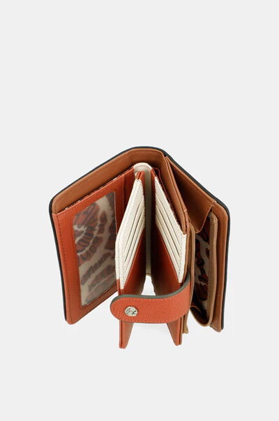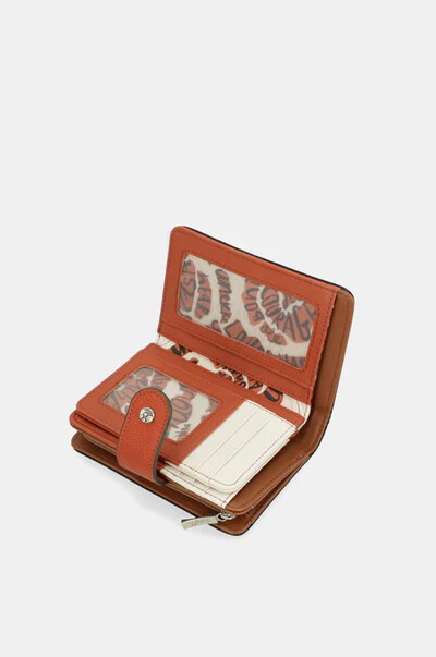 הארנק הבינוני הזה כולל שני תאים עיקריים: בגב הארנק תמצאי תא רחב לשטרות וכרטיסים. בחלק העליון יש רוכסן, ובתוכו תא למטבעות. כל פנים הארנק מרופד.
